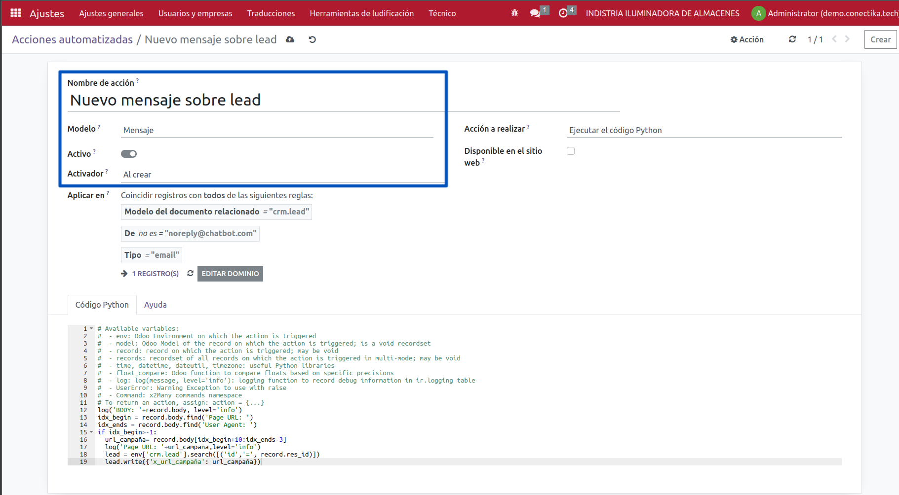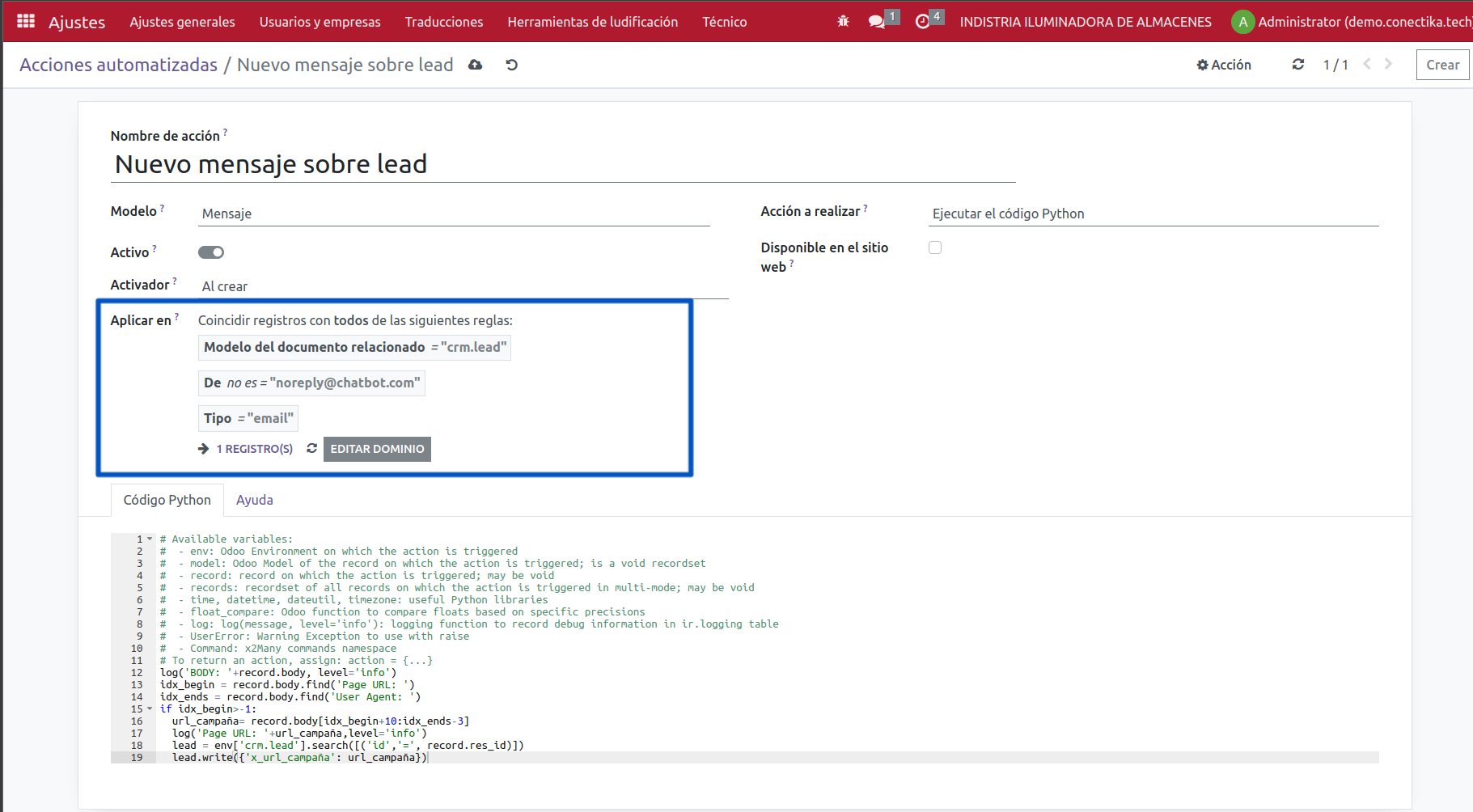 En "Aplicar en: " pusimos un filtro para que nuestro modelo o documento relacionado sean los "Leads/Oportunidades" que llegan con mensajes de correo, que no vengan de un remitente de chatbot y que los mensajes en efecto sean del tipo "email".