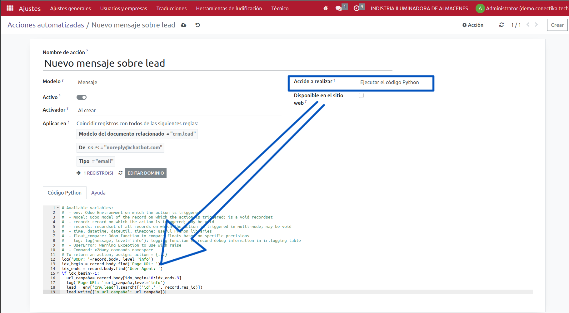 En "Acción a realizar" escogemos "Ejecutar el código python" y escribimos nuestro código.